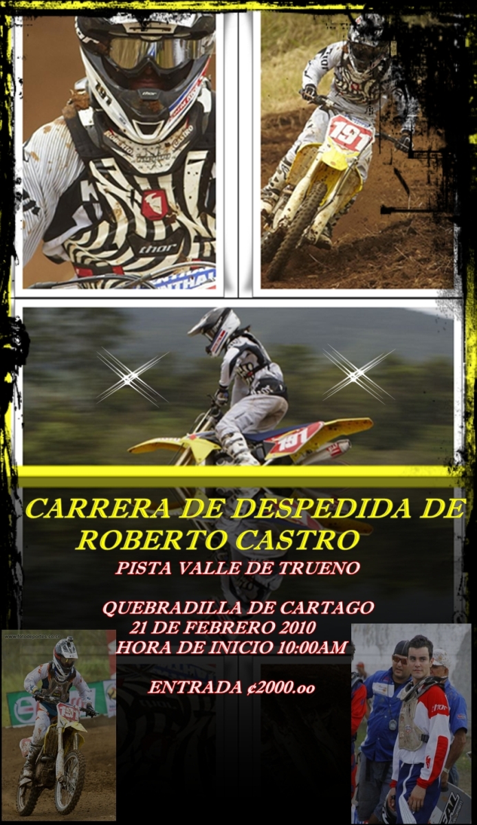 Amigos para los que ya saben y los que no Roberto Castro partirá hacia tierras brasileñas el próximo 24 de Febrero. El estará compitiendo todo el año por allá, hemos planeado una carrera de despedida la cual se realizará: