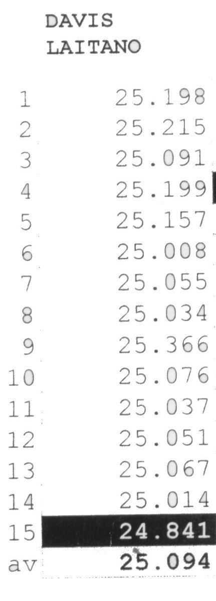 yo queria darle otra vez, pero faltaban como 3 heats para poder darle ,para hacer tiempos!!! y tenia que irme a la choza, je ca..o la dona jeje. todos los tiros baje, pienso que si corria una mas era probable que lo bajara, pero bueno espero bajarte algun dia , ta dicil, ya que este tiempo bajar ya es muy muy dificl, solo imaginate 1.24 841, 1.24,842, 1.24.875 mae eso fue cualquier vara, pero senti que no tenia donde mejorar mas, pero bajar eso ya es dificil,almenos para mi, creo que mis 210 lbs no me dejaran jeje. aunque no importe el peso tanto ahora, no se sabe hasta cuando de peso pesado es bueno, creo que un buen peso seria 180lbs .