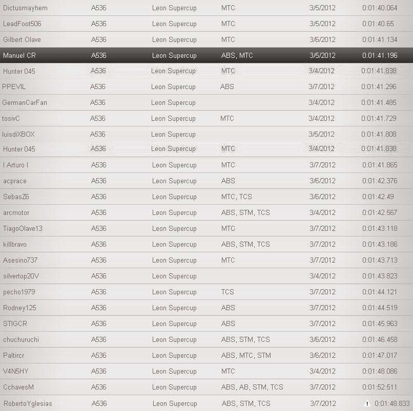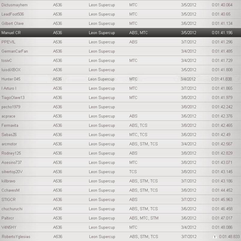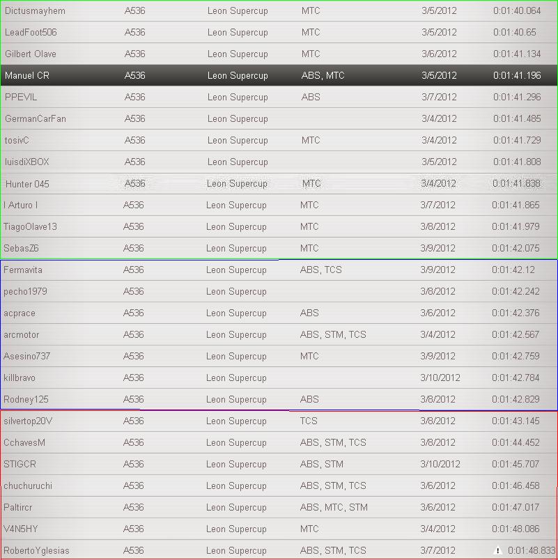 Bueno, aqui a como quedaron con el test del SEAT, los q estan en verde son los PRO, los q estan en azul son Intermedios y los q estan en Rojo son los Amateur: