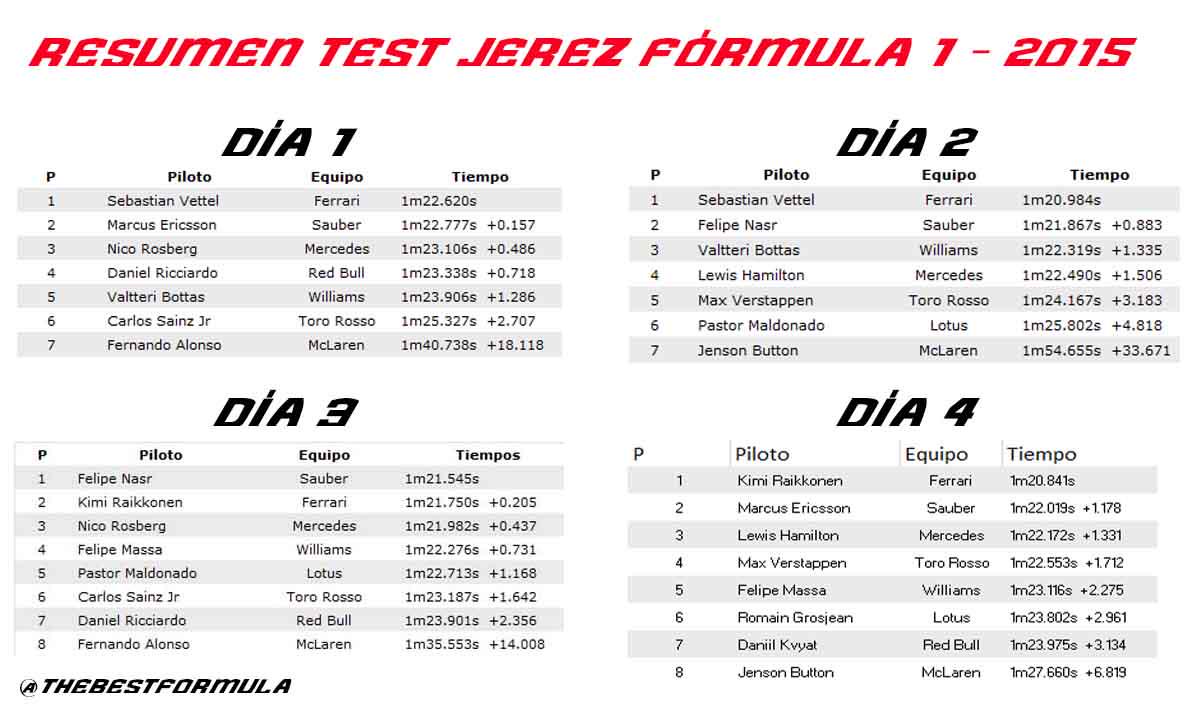 Los grandes ganadores del test y no por haber quedado de primero al final de cada día son los equipos con motores Ferrari, parece que han hecho un excelente trabajo mejorando todos los aspectos del motor, lo cual va a poner interesante las posiciones medias de la tabla. El equipo Ferrari parece que además ha hecho otro buen trabajo con el chasis lo cual espero redunde en que este peleando más de cerca con los Mercedes en la punta, eso que no soy fanático del caballito, pero es bueno ver a los rojos peleando al frente, eso siempre levanta el nivel y la audiencia de este deporte.