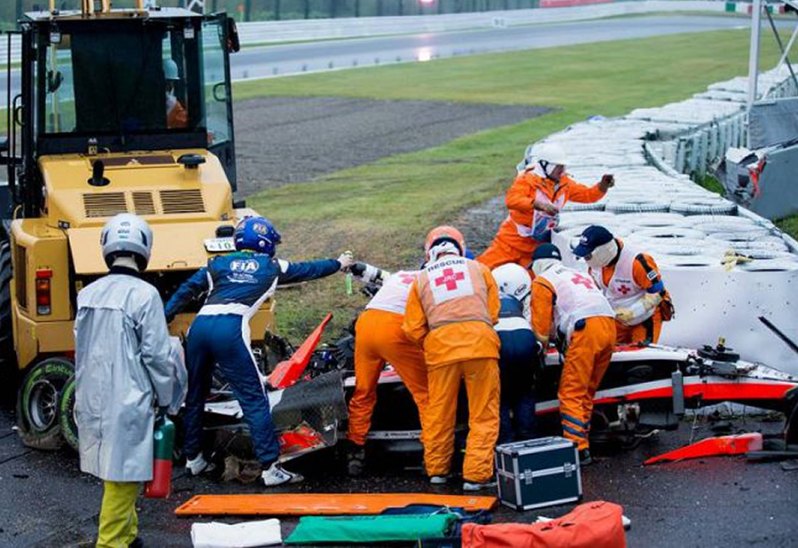Me hizo recordar lo que le pasó a María de Villolta (QEPD) quien tuvo accidente similar en 2012 probando para Marussia... La FIA tendría que eliminar las banderas amarillas locales y cuando se necesite que ingrese una grua o plataforma para remover un auto sacar al safety car para evitar este tipo de incidentes... Ojalá y Bianchi se recupere pronto