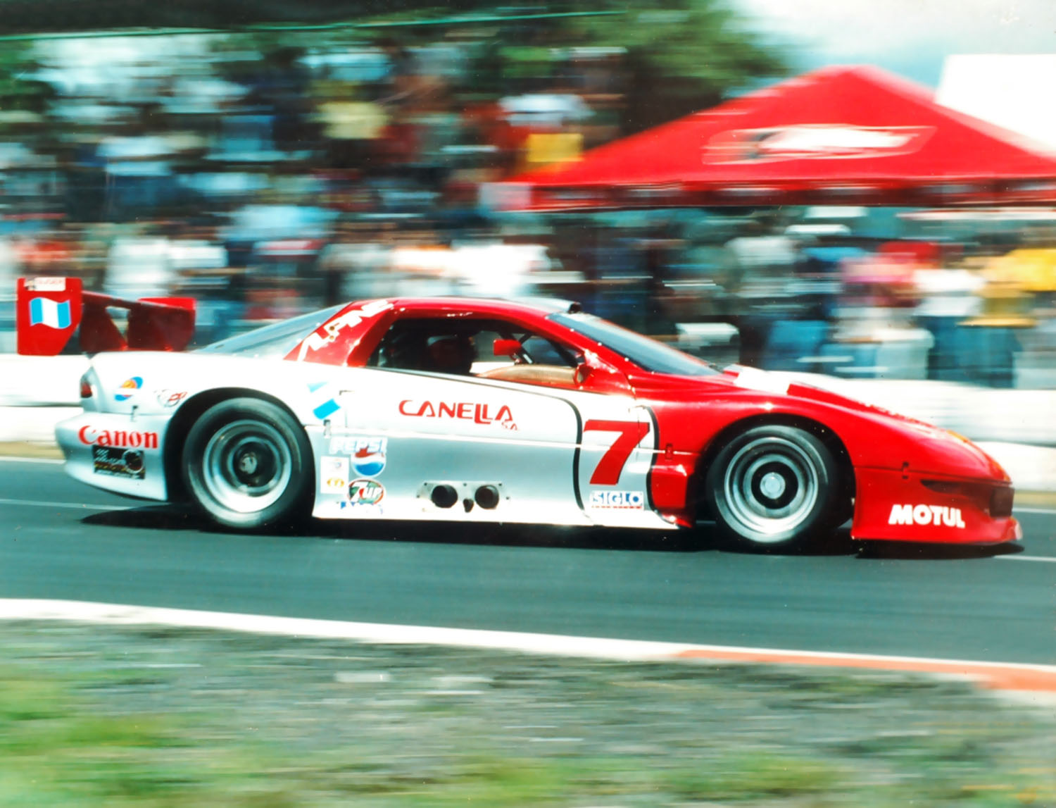 La primera, Luis Mendez en su Porsche para las 3 Horas Marlboro de 1985...Esta foto la tome el dia sabado de las pruebas. Venia a El Salvador como la maxima presentacion del campeonato. Desafortunadamente cuando le estaban bajando el carro del container, lo golpearon y no pudo correr...salio ese sabado, dio un par de vueltas y ya...