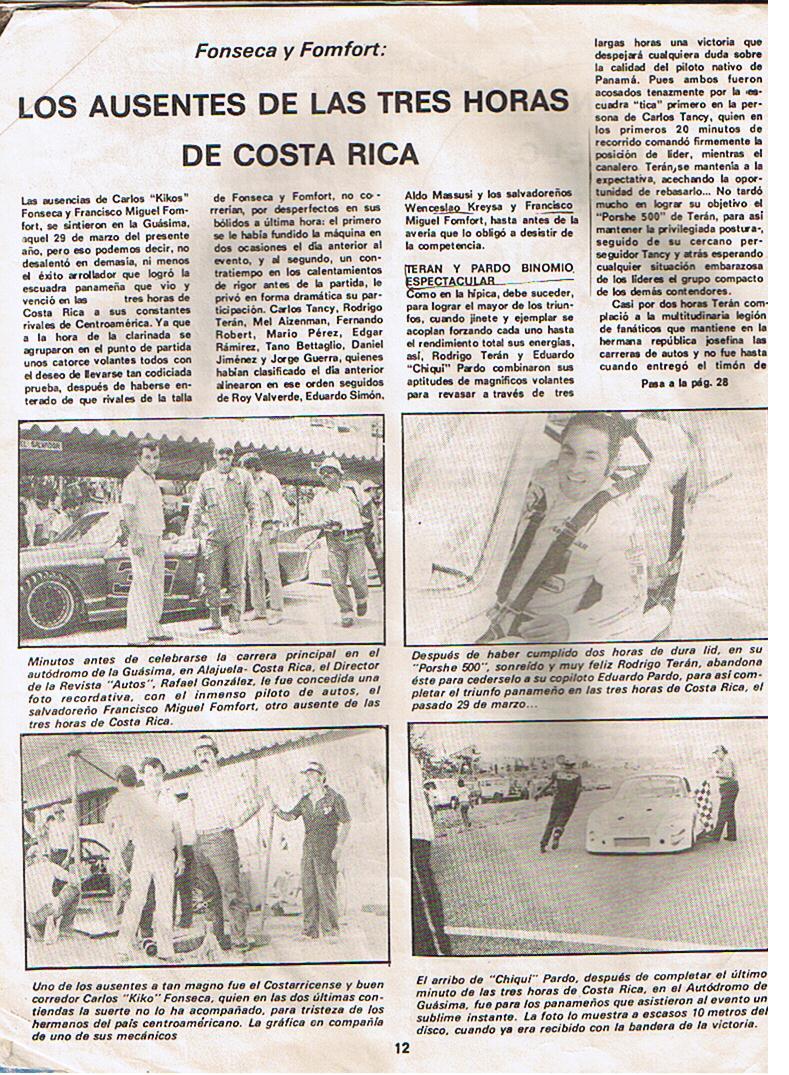 Francisco Miguel FOMFOR, ha sido el piloto centroamericano que más alto llevó el nombre de centroamérica en el automovilismo contemporáneo. Yo vi correr a casi todos los mencionados en este foro, pero ninguno a los niveles de riesgo, temeridad y espectáculo como lo hacía FOMFOR. Johan nos mencionaba un piloto panameño comparable con FOMFOR, lamentablemente nunca tuve información acerca de él. Si alguno de ustedes conoció la semblanza del piloto gringo Mark Donohue, esta es la imágen que yo tengo de FOMFOR. Excelente piloto, pero una persona que sabía indicar a su equipo la puesta a punto del auto.