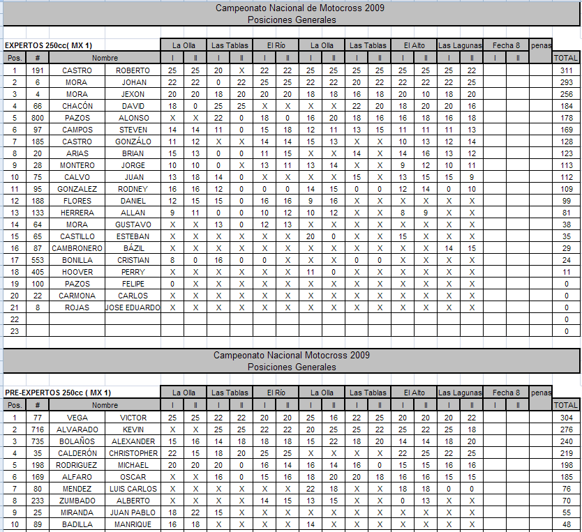 Tras la octava y última fecha del campeonato nacional el cuadro de campeones también quedó conformado por Alejandro Rojas (MX2)*, Víctor Vega (Pre-Expertos MX1), Sergio Agüero (Pre-Expertos MX2), Diego Vargas (Amateur), Esteban Mora (85 c.c. A), Carlos Luis Arce (85 c.c. B), Steven Masís (65 c.c. A), Yarot Vargas (65 c.c. B), Edress Saborío (50 c.c. A) y Johan Aguilar (50 c.c. B). Ver los puntajes acumulados del top 3 por categoría al final de este reporte.