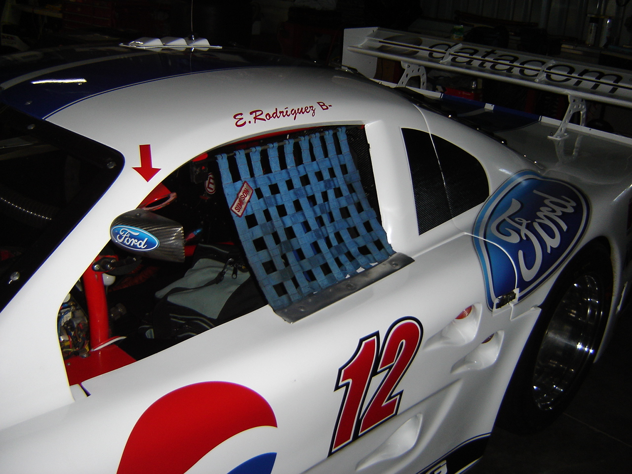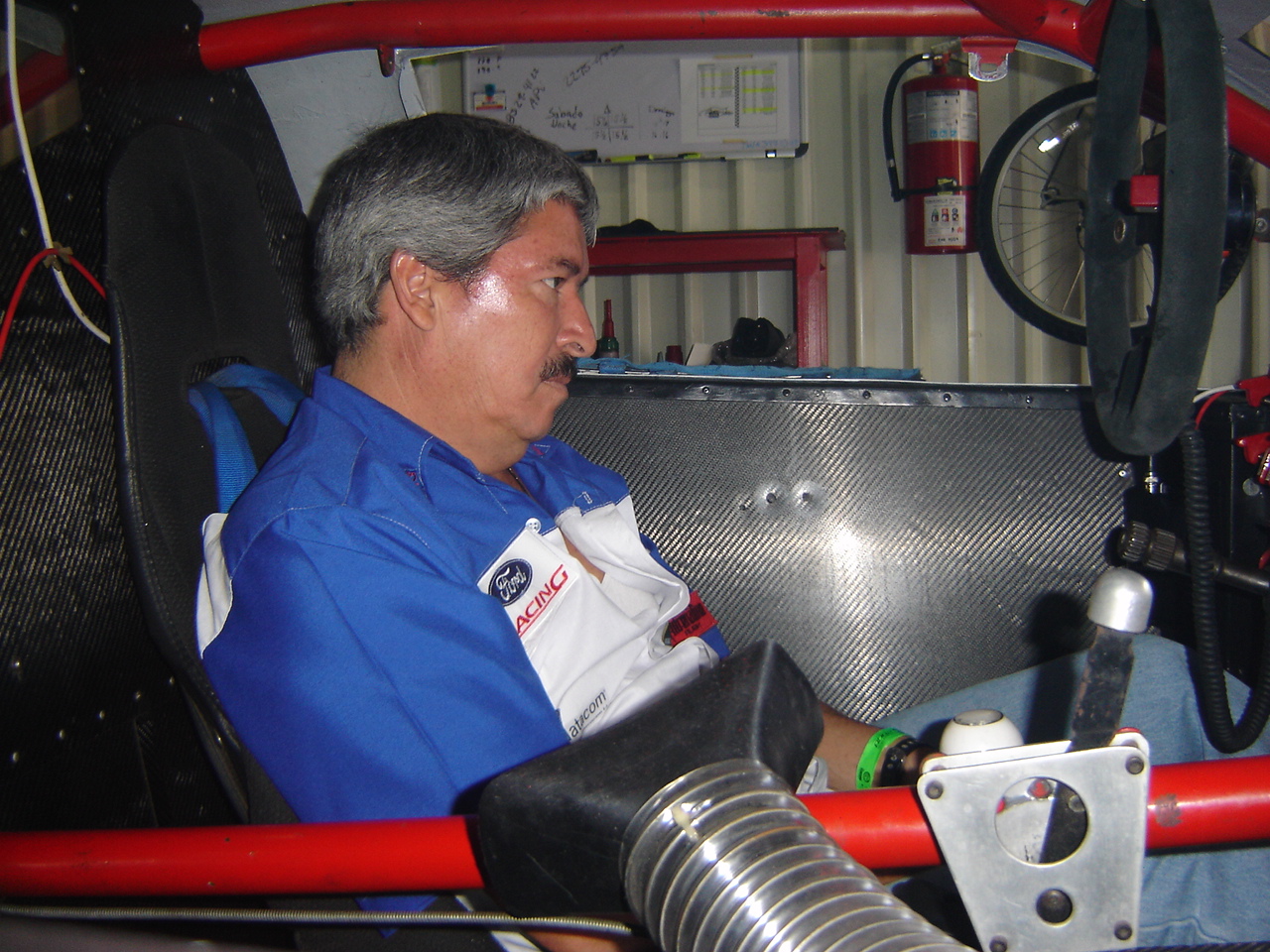 Siendo mi peso el mas cercano al de Teto me "encaramaron" en el mustang pa hacer la pruebas de peso, recordemos q el carro iba con 83lbs de lastre. Wow, dentro del cockpit son otros cien pesos, el espacio es justo, caliente, la vision un tanto incomoda a los lados y atras... GRANDE Teto dominar esta bestia de +/- 800 caballos ( 802 como dice el mismo: el d la trompa y el q maneja...