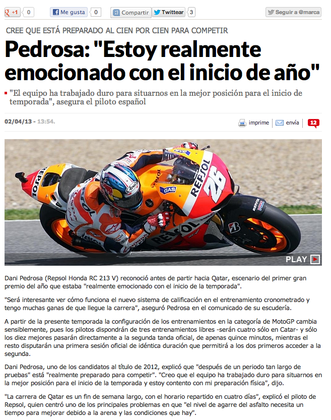 Después de firmar en 2012 su mejor temporada en MotoGP™ - y de intentar dar caza a Lorenzo hasta la última carrera- Pedrosa intentará continuar con el impuso que tenía en la segunda mitad de esa campaña y de empezar con el pie derecho el curso 2013: "Hemos hecho unos buenos tests durante el invierno y estoy deseando que empiece la primera carrera. Parece que va a ser una temporada emocionante. ¡Estoy en forma y a punto para que comience!”.
