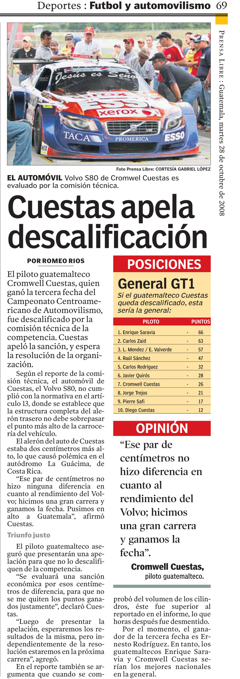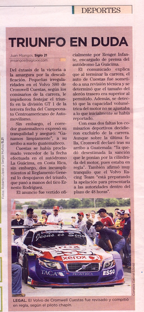 Agustin, el punto que traes sobre la mesa esta perfecto...pero...el punto es que el reglamento no permite tolerancias o diferencias y segun las medidas que le hicieron al Volvo, no cumplio con lo establecido con el reglamento. Punto. Talvez es injusto porque no hace diferencia en el performance del carro (no lo se, ni pretendo saberlo) pero mi punto es que el reglamento es el reglamento, y si tiene vacios, pues lo que hay que cambiar es el reglamento pero eso se hace no a mitad del campeonato, eso se hace antes ya que entiendo que este se reviso por todas las partes involucradas...Sobre las fotos del 2007 que enviastes del Corvette y Almera? que se puede decir? eso fue en el 2007, por no los protestaron? Estaban en sus plenos derechos, o no?