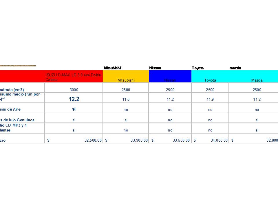 2. Economía: Es el mas eficiente de todos aun con un motor de 3.0 litros, en caunto a la potencia si bien es cierto no es tan potente como el navara o el hilux 3.0, tiene la ventaja que alcanza hasta un 90% del torque del motor en menos de 2000 rpm, por eso ninguno lo deja botado!!!