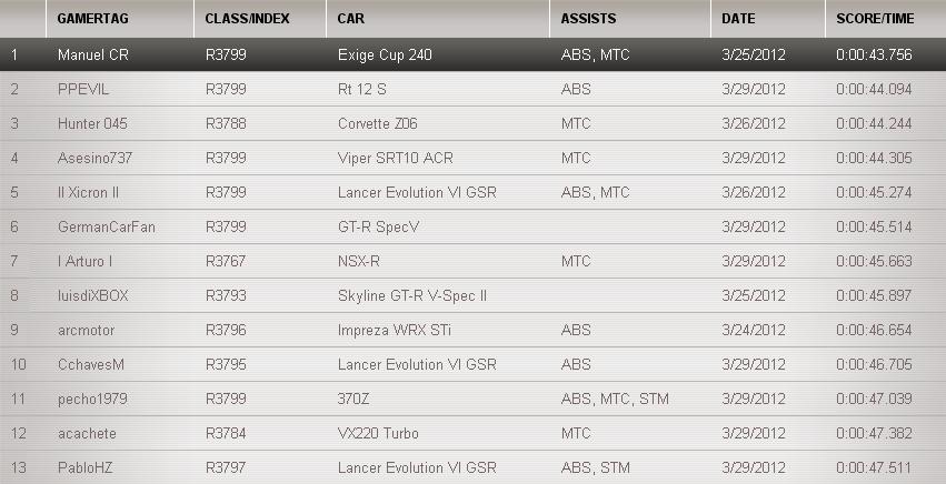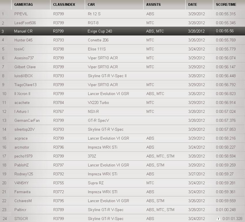 La otra es q crei por mucho q sin el TCS los AWD iban a andar mejor, pero este no fue el caso!, y me embarque metiendo tiempos con el Exige. Aunque ya el Porsche esta mas arriba mio y el C6 anda muy cerca.