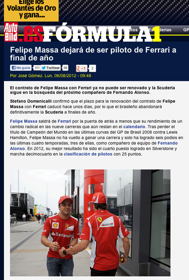 En el ambito de la F1 se da por hecho que Felipe no correra con Ferrari el proximo año, pero la publicacion no la veo por ningun lado por el momento.
