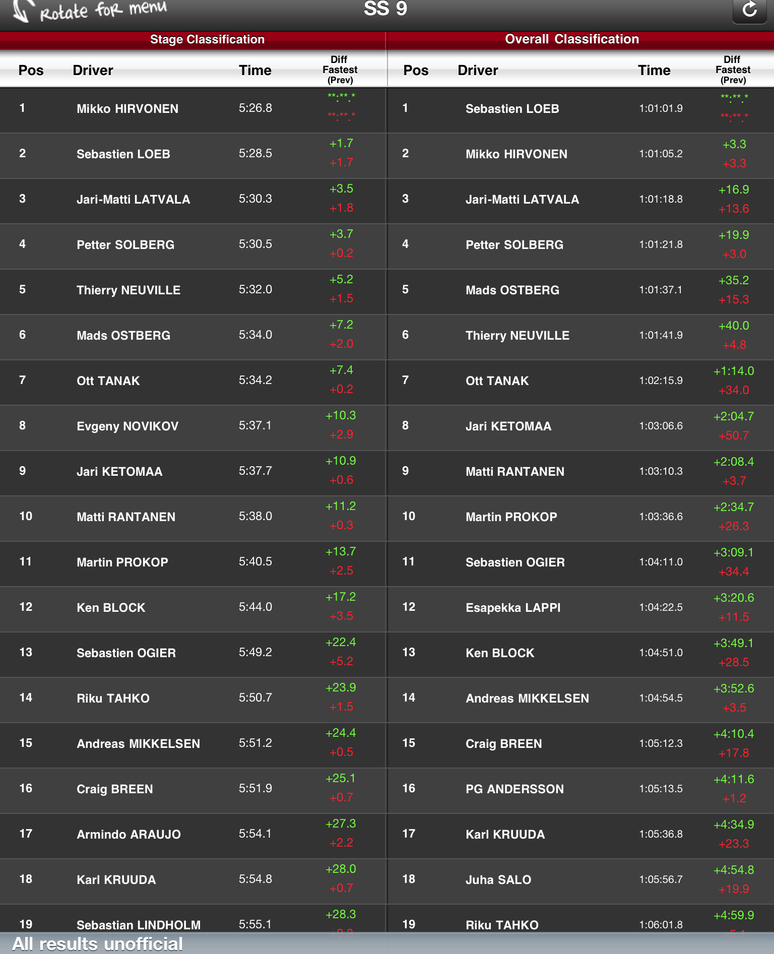Loeb, cuya victoria supone la número 73 en el WRC e iguala en triunfos en Finlandia a Juha Kankkunen, supo soportar la presión a que le sometió su compañero de equipo en Citroën, el finlandés Mikko Hirvonen, para adjudicarse la prueba nórdica por tan sólo 6.1 segundos de margen después de completar la segunda pasada por el famoso tramo de Ouninpohja.