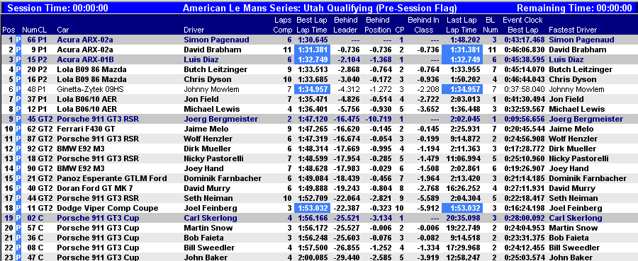 Nada podía hacer por batirle el coche idéntico de Highcroft Racing pilotado por David Brabham, que terminaba a siete décimas en la sesión de calificación. Brabham, un piloto menos físico que Pagenaud, parece que todavía no ha encontrado la quinta esencia al Acura LMP1. En LMP2 otra pole position para el Acura ARX-01b de Fernández Racing pero ya a más de dos segundos de Pagenaud, pero a pesar de todo Luis Díaz podía batir a los dos Lola B09/86 Mazda de Dyson Racing, pilotados en calificación por Butch Leitzinger y Guy Smith. No fue malo el debut del Ginetta-Zytek 09HS de Corsa Motorsports logrando Johnny Mowlem la sexta posición por delante de los dos Lola B06/10 de Intersport y Autocon.