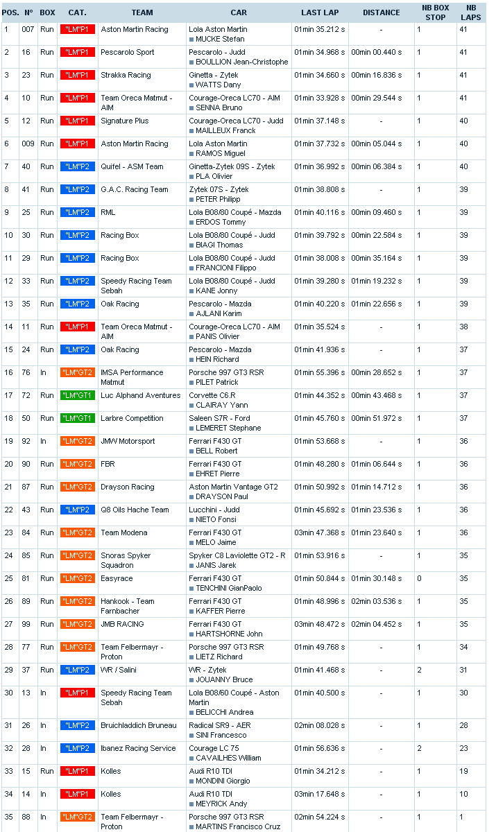 En GT1 también la victoria fue bastante fácil para el Chevrolet Corvette C6R de LAA pilotado por Julien Jousse, Patrice Goueslard y Yann Clairay. En GT2 la victoria era para el equipo JMW Motorsport con un Ferrari 430 GT para Gianmaria Bruni y Robert Bell, mientras Antonio García era tercero junto a sus compañeros Jaime Melo y Leo Mansell.