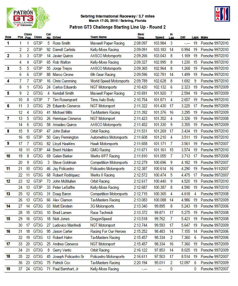 Los pilotos costarricenses Javier Quirós y Jorge “Koki” Trejos, se ubicaron en el segundo y tercer puesto respectivamente de la primera carrera del torneo Patron GT3 Challenge, de la International Motor Sport Asociation (IMSA por sus siglas en inglés) de los Estados Unidos. Ambos corredores compitieron en autos Porsche 911 en la norma Platinium –modelos 2010- y con estas posiciones ganaron el derecho de podio. La prueba se efectuó en Sebring, estado de Florida.