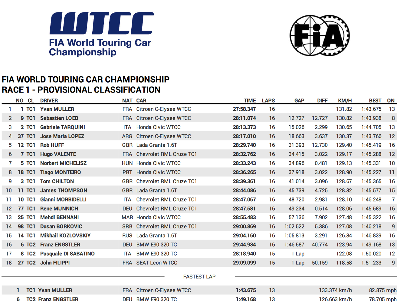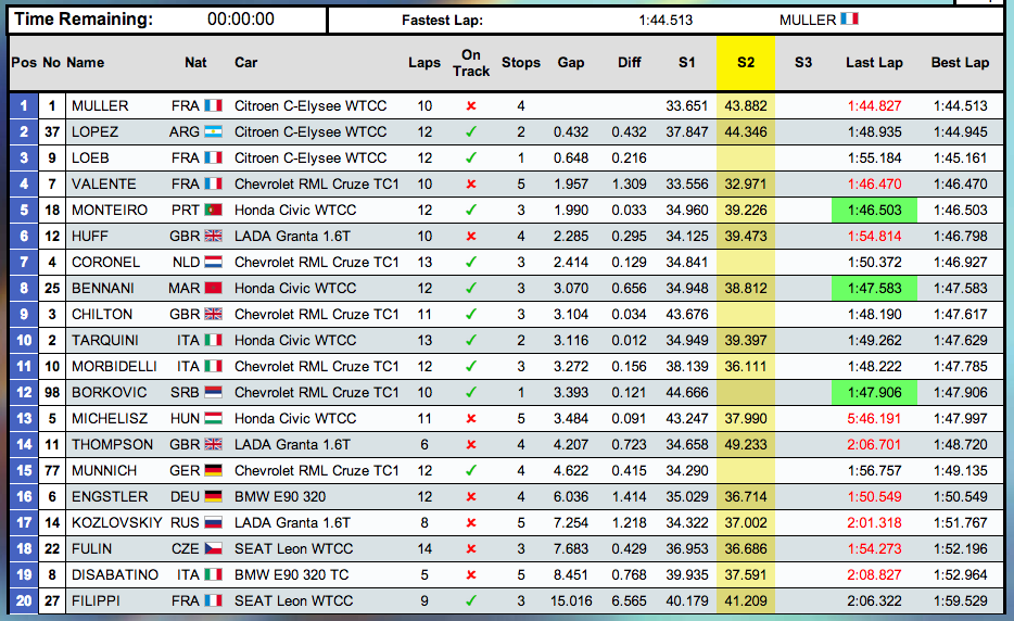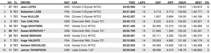 Finalmente el campeón Yvan Muller marcó la vuelta rápida (1:44.513), seguido por José María López (1:44.945) y del francés Sebastien Loeb (1:45.161).