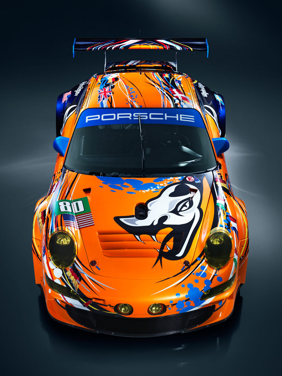 Created by California-based artist Troy Lee, the livery celebrates the history of Porsche at Le Mans, featuring the 28 drivers who have won the 24 Heures du Mans overall in a Porsche. The No. 80 and No. 81 designs are identical, implemented in complementary colors: candy metallic orange for the No. 80 and candy metallic blue for the No. 81; both anchored by a deep ocean blue. Primary colors provide a backdrop for the driver names and flags which weave throughout the design on the Porsche 911 GT3 RSR.