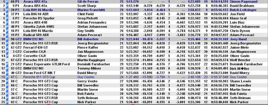 En lo que respecta a GT2, ante la ausencia de GT1, Jörg Bergmeister y Pat Long son líderes con 100 puntos pilotando un Porsche 997 RSR de Flying Lizard Motorsports, con el que han logrado todas las victorias de la temporada excepto la de Sebring. Precisamente fue en Florida donde Risi Competizione, con Jaime Melo y Pierre Kaffer, consiguieron la única victoria de la temporada con su Ferrari 430 GT.