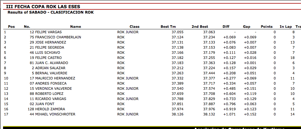 Con esto el nivel de la Rok cup dará mucho de qué hablar para este fin de semana, que seguirán paliando la clasificación a 2 puestos al mundial en cada categoría, los clasificados a este punto son Bernal Valverde y Roberto Lopez en la categoría ROK y en la Jr ROK Felipe Vargas y Mauricio Hernandez, son los 4 pilotos que defenderán sus puestos.