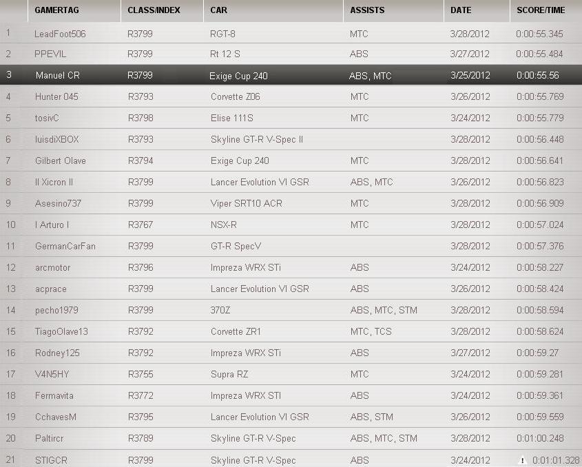 La otra es q crei por mucho q sin el TCS los AWD iban a andar mejor, pero este no fue el caso!, y me embarque metiendo tiempos con el Exige. Aunque ya el Porsche esta mas arriba mio y el C6 anda muy cerca.