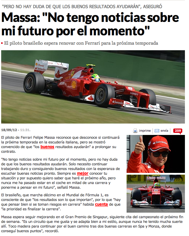 Eso es lo que yo quisiera creer y aojala sea asi, pero entre lineas despues de Monza, Alonso dejo entrever que le preocupaba Singapur, despues de la carrera dijo, que seria preocupante si llegaran al circuito nocturno y estuvieran 5 o 6 segundos detras de la punta otra ves.... oajala y sea paranoia mia nada mas... por que de verdad quiero ver esas basnderas rojas agitarse de nuevo por que hay un piloto campeón en la casa... banderitaa .