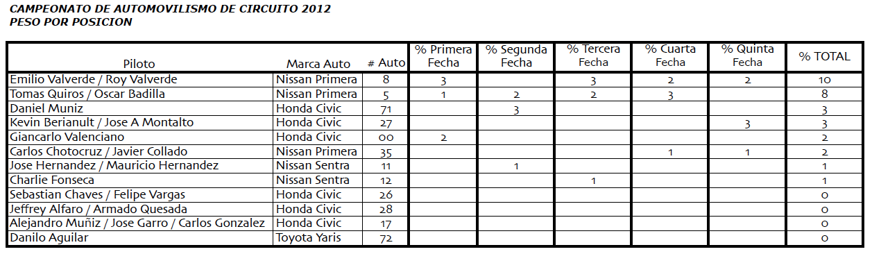 Mirá vos, está bonita la tabla que armaron en LN, con las posiciones en las fechas y todo. Lástima nada más que no incluyeron el peso/lastre de los carros además del caballaje, en lugar de por ejemplo los aros que son igual medida para los 3.