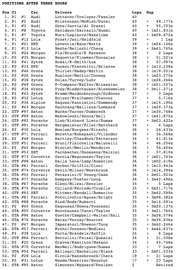 Por ahora los audi giran alrededor de los 3:27 mientras que los toyota van más cerca de los 3:34, y se calcula que los toyota tienen unas dos vueltas más entre cada parada en pits.