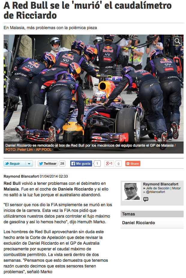 RBR va a tener que ganarle a la FIA ademas de a los otros equipos si quiere ser el campeón en 2014. La guerra esta declarada desde la primera carrera y el fallo del segundo sensor le da la razón a RBR desde Australia.