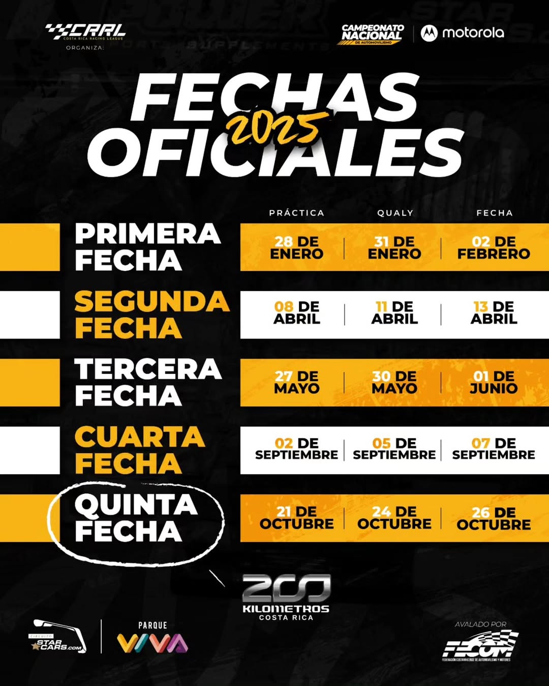 La temporada 2025 del automovilismo nacional se compone de un total de cinco fechas, cada una de ellas con un día de práctica oficial y una clasificación. La primera jornada está pactada para el domingo 2 de febrero, la segunda está programada para el 13 de abril, la tercera el 1 de junio. En septiembre será la cuarta fecha y la gran final será el 26 de octubre, esta carrera bajo el nombre de los 200 Kilómetros Costa Rica.