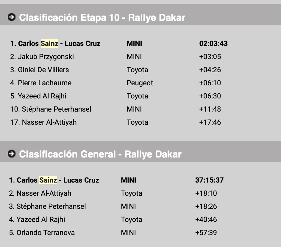 Carlos Sainz:«Estoy contento con la etapa de hoy, ha sido un buen día, aunque la navegación era difícil desde el principio, no hemos cometido ningún error. Nuestra velocidad era buena y hemos atacado. Había un poco de tormenta de arena, la visibilidad no era muy buena y había bastantes lenguas de arena cortadas. En una de ellas hemos dado un golpe bastante fuerte y además había un punto de control complicado que lo hemos encontrado sin muchos problemas. En resumen ha salido bien todo. No pensé que Nasser y Stéphane estarían tan atrasados, pero hay que ser prudentes, mañana podría ser lo contrario, tenemos que estar concentrados».