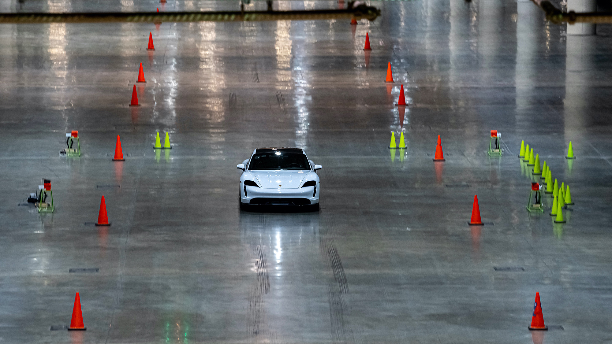 La estrategia de Keen consistió en ir acelerando progresivamente, con tandas de prueba a baja velocidad. Los neumáticos de carretera de serie fueron precalentados por precaución. Cuando llegó el momento de batir el récord, bastó con un intento. “Me tomé un momento en la línea de salida, sabiendo que iba a tener que ir lo más rápido posible y volver a parar, todo antes de llegar al muro que me esperaba al final y tenía toda mi atención. Utilicé el launch control y el Taycan simplemente se catapultó. La sensación de velocidad en el interior, incluso en un espacio tan grande, es enorme. Ese muro se acercaba muy rápidamente. Al final, los frenos del Taycan estuvieron más que a la altura. Por supuesto, no me fijé en mi velocidad, así que fue una sorpresa y un alivio saber que había batido el récord con un margen tan grande. Ha sido adrenalina total. Estoy agradecido a Porsche por confiar en mis habilidades, por sus preparativos y ánimos: 165,1 km/h dentro de un edificio. ¿En qué estaba pensando?”.