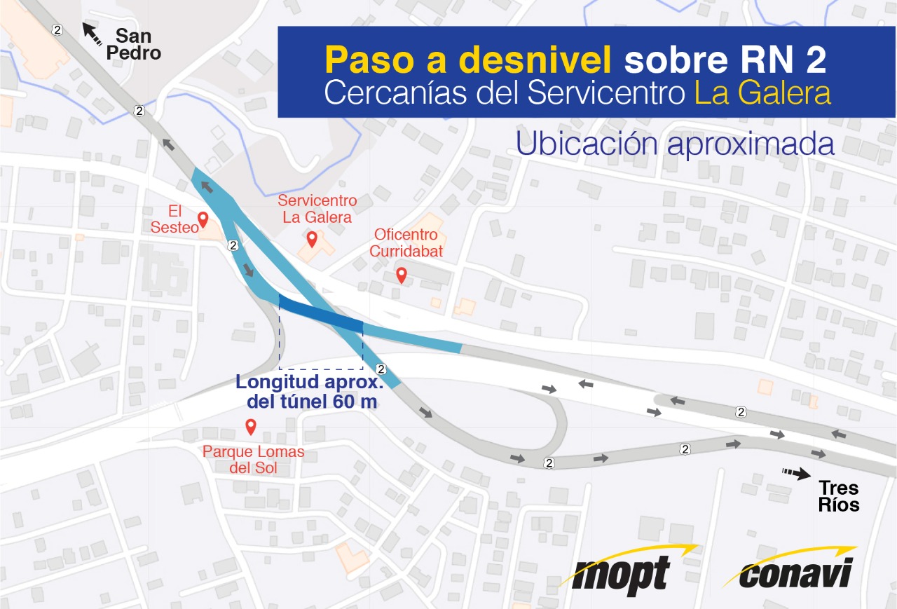 Los trabajos incluyen la construcción de un túnel de 60 metros en el cruce cercano al servicentro La Galera, el cual permitirá extender el carril exclusivo de autobuses que actualmente va de la fuente de la Hispanidad hasta las cercanías de Muñoz y Nanne, en San Pedro, hasta Tres Ríos de La Unión.