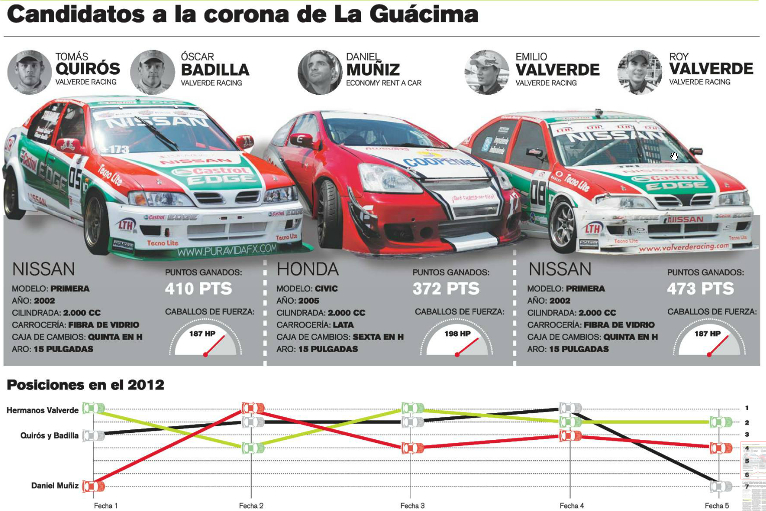 Mirá vos, está bonita la tabla que armaron en LN, con las posiciones en las fechas y todo. Lástima nada más que no incluyeron el peso/lastre de los carros además del caballaje, en lugar de por ejemplo los aros que son igual medida para los 3.