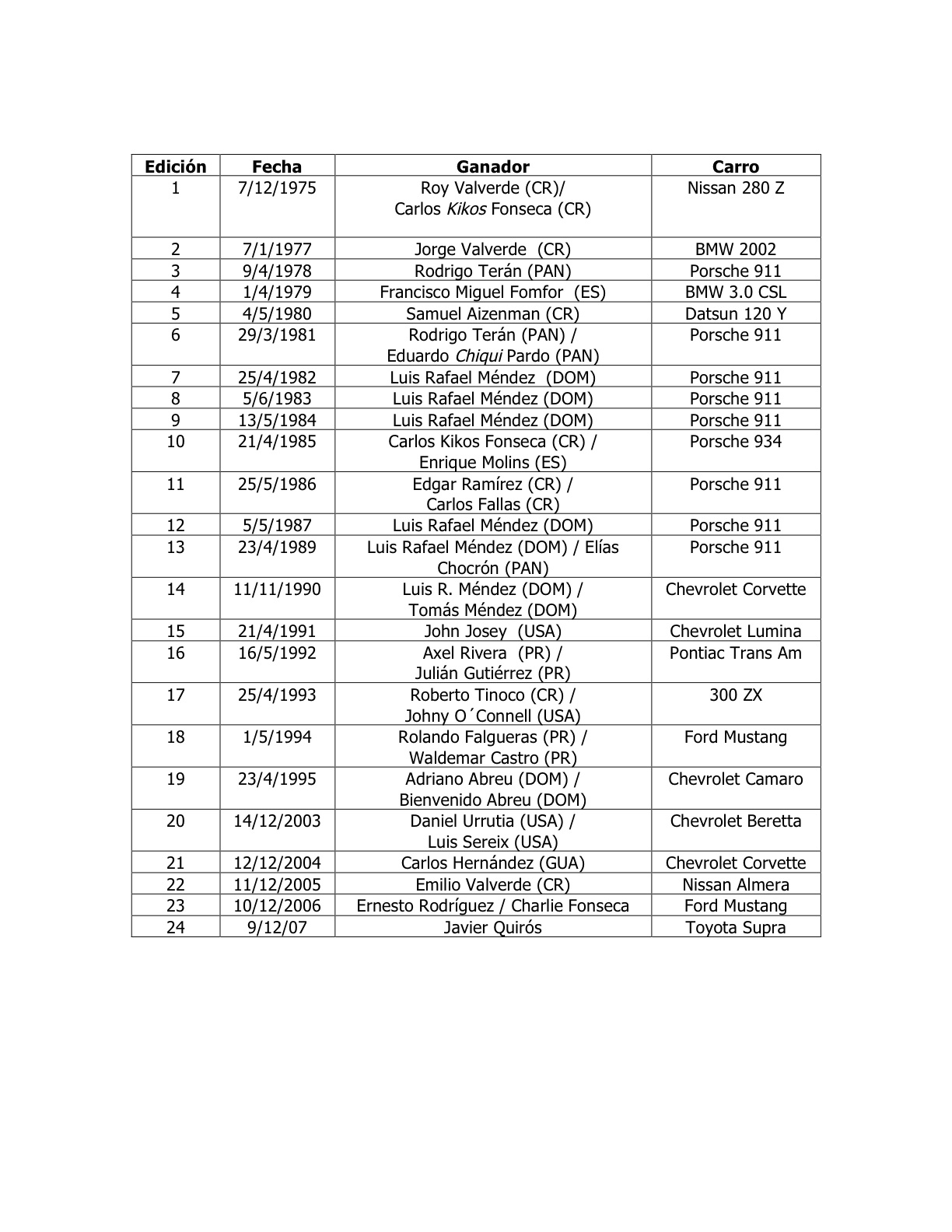 Adjunto encontrarán la lista de ganadores de las 24 ediciones anteriores de las Tres Horas de Costa Rica, así como las fechas en que se corrieron. Como podrán ver, de todas las carreras que se han realizado, 17 se han efectuado en la primera mitad de año.