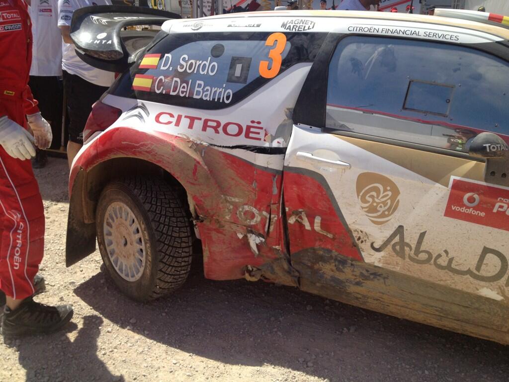 Sordo se vio forzado a abandonar después de salirse en una curva de derechas y colisionar con una roca, lo que impidió continuar debido a los daños causados al vehículo.