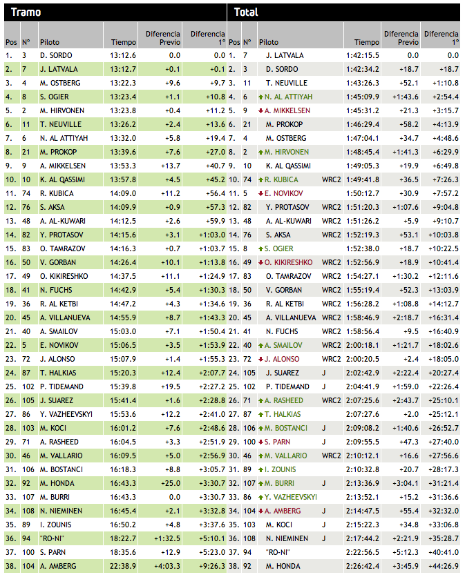 Mads Østberg:Otro nuevo toque del noruego en el quinto tramo y perjudicado por ir limpiado los tramos le ha echo perder un tiempo valioso, beneficiado de los problemas de su compañero/rivales y de la lluvia final se encuentra en sexto lugar.