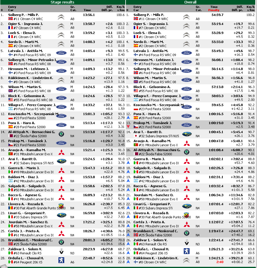 A los mandos de sendos Citroën C4 World Rally Car similares al de Sordo, Solberg y Ogier han finalizado en primer y segundo puesto en los tres primeros tramos, y en la clasificación general sus Citroën se encuentran en primera y segunda posición, por delante de los pilotos oficiales de la marca, Sebastien Loeb y Dani Sordo.