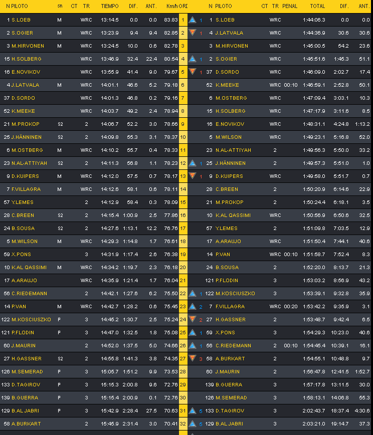 Nuevo cambio de líder en el último tramo de la jornada, que se ha desarrollado de noche en su totalidad y donde Sébastien Loeb (Citroën) recuperaba la primera plaza de manera espectacular con su segundo scratch del día (13:14.5), si bien este también ha venido motivado por un pinchazo de Jari-Matti Latvala (Ford) al ceder 46.6 segundos con respecto a Loeb, quedando ahora ambos separados por medio minuto en la clasificación general el término de la primera etapa.