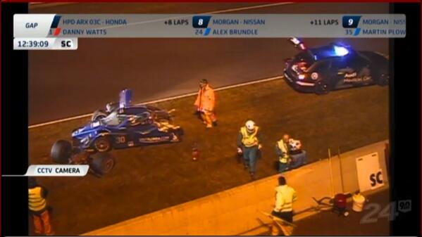 Marc Gené en el Audi #3 pincha una llanta muy lejos de la entrada a pits, le toca dar casi toda la vuelta con 3 llantas.