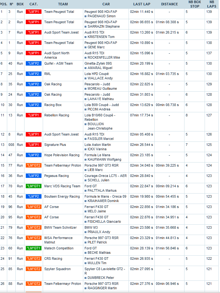 Así, Sebastien Bourdais, Lamy y Pagenaud se imponían en una extraña carrera, seguido por sus compañeros Stephane Sarrazin y Montagny. Kristensen, McNish y Capello acababan terceros mientras la cuarta plaza era para Anthony Davidson , Alex Wurz y Gené que habían hecho una carrera inteligente pero que, una salida del de Bellaterra en la parte final les privaba de poder alcanzar al Audi y subir al podio. La quinta plaza era para el segundo de los Audi oficiales con Mike Rockenfeller, Romain Dumas y Bernhard.