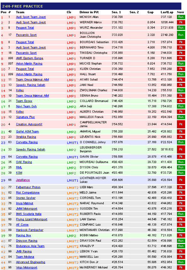 Pedro Lamy, Christian Klien and Nicolas Minassian will run the #7 Peugeot. Sebastien Bourdais, Franck Montagny and Stéphane Sarrazin run the #8 with David Brabham, Marc Gené and Alex Wurz in the #9 car.