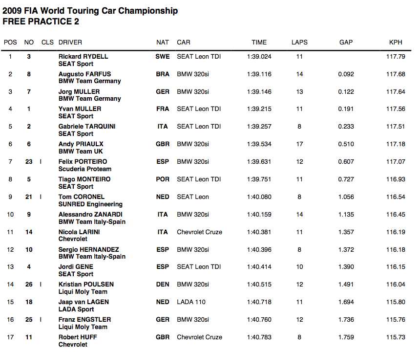 Entre los SEAT, Tarquini, Rydell, Yvan Muller y Monteiro (por ese orden) tratarán de trabajar en equipo, pues partirán en grupo acaparando la segunda y la tercera líneas de la parrilla. Jorg Muller, el tercero en discordia en BMW, ha obtenido el séptimo mejor registro. Los tres españoles del campeonato, todos ellos situados entre los diez mejores de la sesión final, han acabado ocupando las tres últimas posiciones de esa frenética lucha que en cuestión de diez minutos reparte las diez primeras plazas de la parrilla: Porteiro, el mejor privado, ha sido octavo. Gené, el peor de SEAT, noveno. Sergio Hernández, mejor que su compañero Zanardi, décimo.
