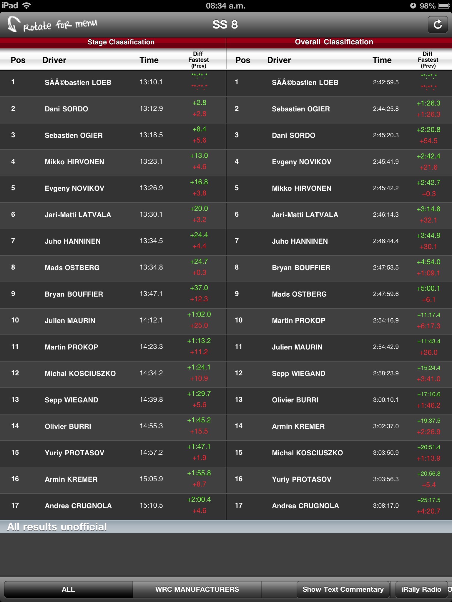 There were no split times on any of Wednesday's four stages, and incorrect results were listed for the afternoon - when Thierry Neuville was shown as the rally leader instead of Sebastien Loeb in a jumbled top 10.