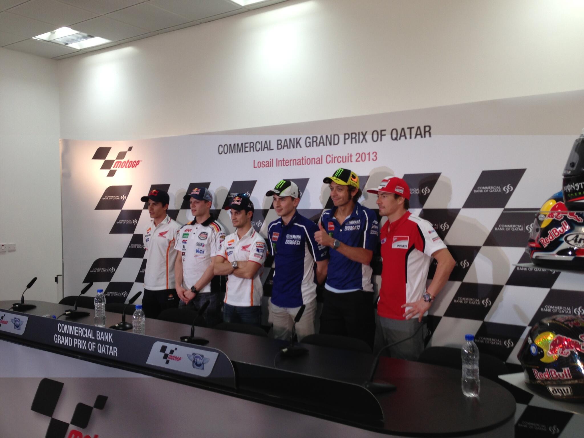 Jorge Lorenzo (Yamaha Factory Racing), su compañero de equipo Valentino Rossi, el dúo del Repsol Honda Team, Dani Pedrosa y Marc Márquez, Nicky Hayden (Ducati Team) y Stefan Bradl (LCR Honda MotoGP) se han reunido el miércoles por la tarde en la sala de prensa de Losail y han compartido sus impresiones antes del comienzo de la acción en el GP inaugural de la temporada de MotoGP™ 2013.