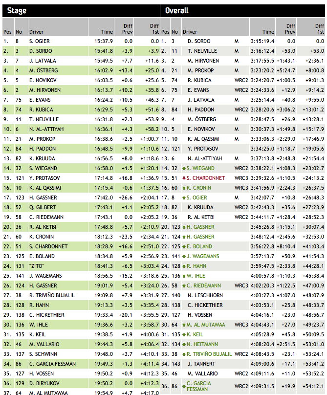 El favorito local, Sepp Wiegand, ha sido cuarto con otro Skoda Fabia S2000, pero a más de 10 minutos del trío de cabeza después de romper la suspensión de su coche al chocar contra un árbol en la duodécima especial. A pesar del incidente, Wiegand ha hecho un balance positivo del fin de semana. “Creo que ha ido bien, especialmente la lucha de ayer con Hayden”, ha declarado. “Después de mi accidente no ataqué porque no tenía sentido ya que la diferencia era amplia. El cuarto puesto es mejor que nada…”