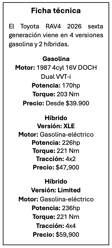 En tecnología, el RAV4 2026 incorpora un sistema multimedia de nueva generación, con una pantalla central de 10,5 pulgadas y un clúster digital de 12,3 pulgadas, elevando la experiencia de conectividad y personalización a bordo. La gama está compuesta por cuatro versiones gasolina y dos híbridas, estas últimas con batería de iones de litio para un desempeño más eficiente.