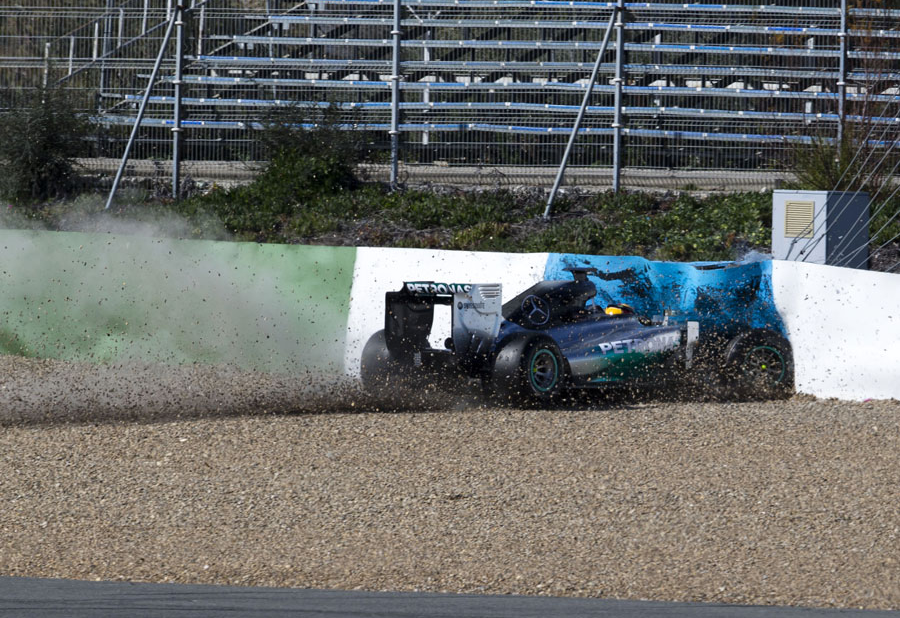 Hamilton rompe su Mercedes al salirse de la pista en los ensayos de Jerez