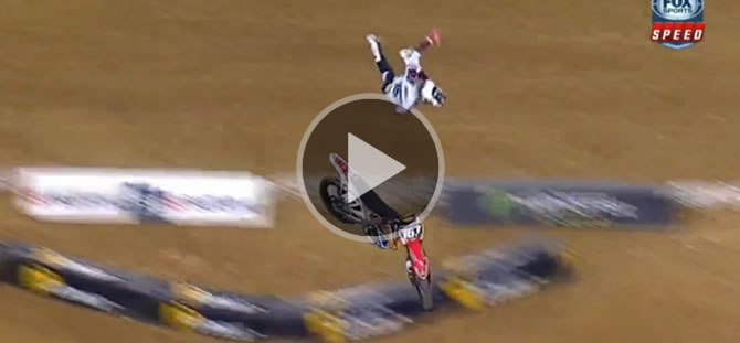El piloto norteamericano Zach Bell pierde el control de su motocicleta durante uno de los heats del AMA Supercross en Dallas este sábado por la noche.