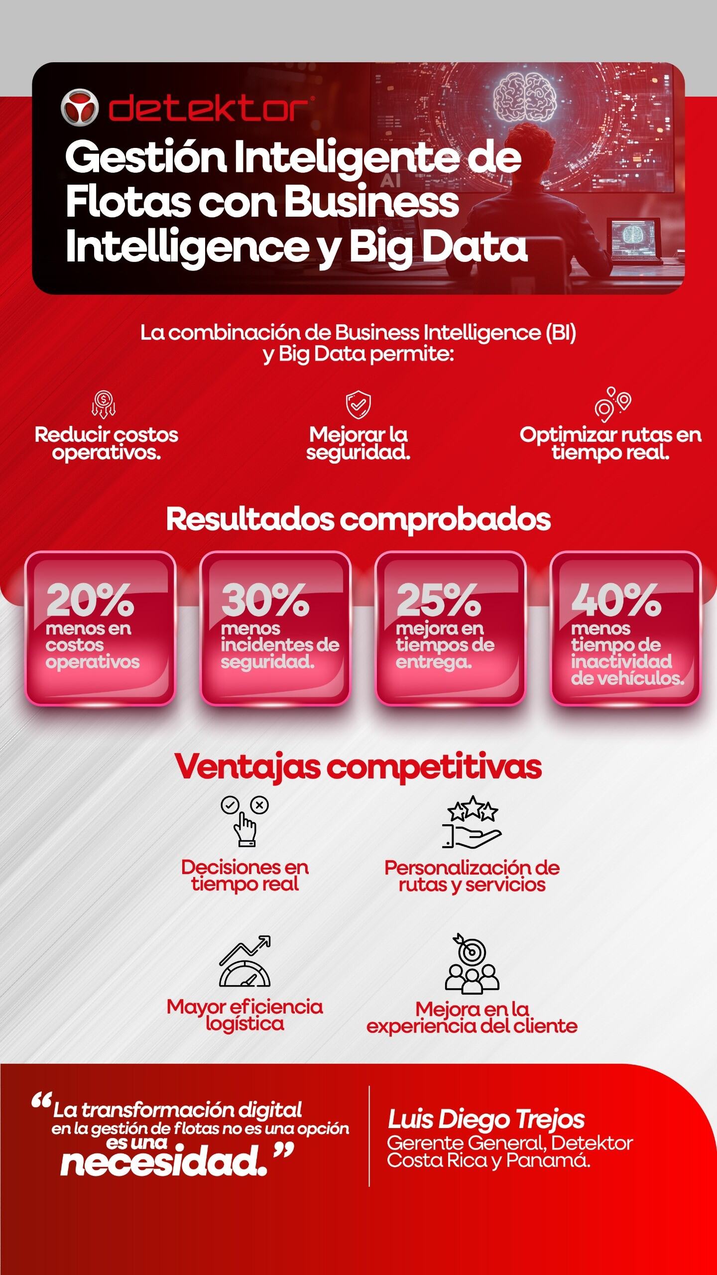 Luis Diego Trejos, gerente general de Detektor Costa Rica y Panamá, destacó la importancia de estas tecnologías: «La transformación digital en la gestión de flotas no es una opción, es una necesidad. Con el uso de BI y Big Data, podemos ofrecer a nuestros clientes un servicio más ágil, seguro y eficiente, optimizando rutas, reduciendo costos y mejorando la seguridad en carretera.»