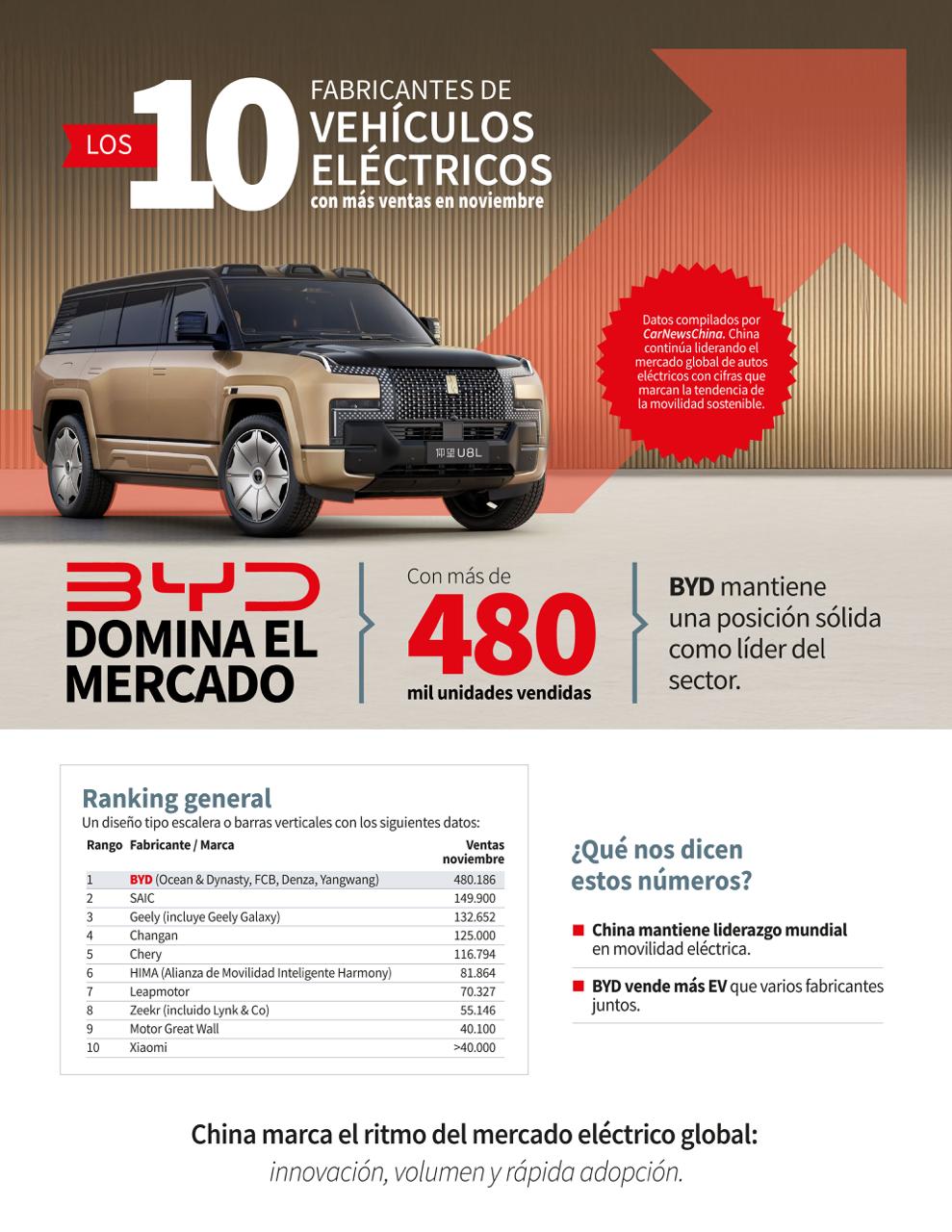 El ranking es encabezado por BYD, que alcanzó 480.186 unidades vendidas, posicionándose como el fabricante con mayor volumen de ventas de vehículos eléctricos a nivel mundial. Le siguen SAIC con 149.900 unidades, Geely(incluyendo Geely Galaxy) con 132.652, Changan con 125.000 y Chery con 116.794 unidades.