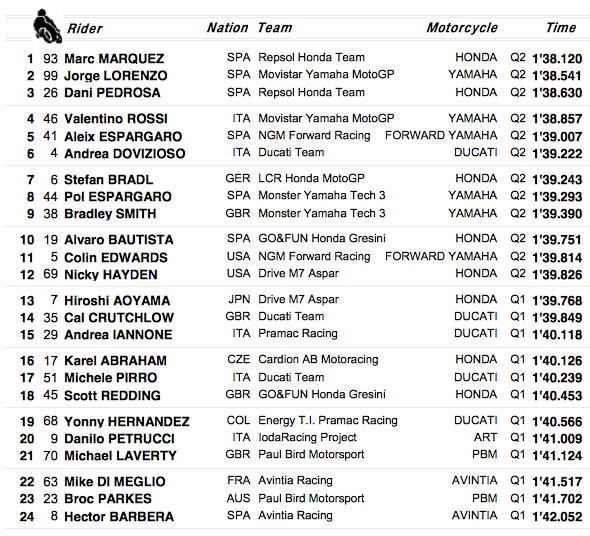 El vigente campeón del mundo y líder destacado del mundial, tras tres victorias en las tres primeras carreras del año, volvió a mostrarse intratable para firmar la 41ª ‘pole’ de su carrera, por delante de sus compatriotas Jorge Lorenzo (Yamaha) y Dani Pedrosa (Honda), a 421 y 510 milésimas, respectivamente.